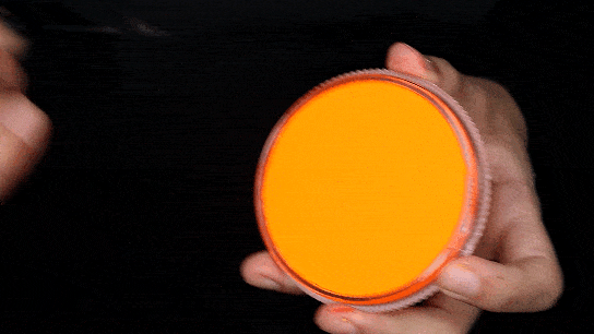Regular face paints are activated with water. When using a brush, you should get the brush wet with enough water so that you can work up a creamy consistency before using the face paint. One common newbie mistake is not mixing up the face paint and water sufficiently so that when it is applied to the skin, it looks transparent and weak because it's lacking pigment. Especially for white and black, which are used frequently for outlining, it's best to make a small hole in the face paint in which you can mix up a good amount of face paint and water for outlining use. This will help keep you from over-saturating the rest of the face paint.