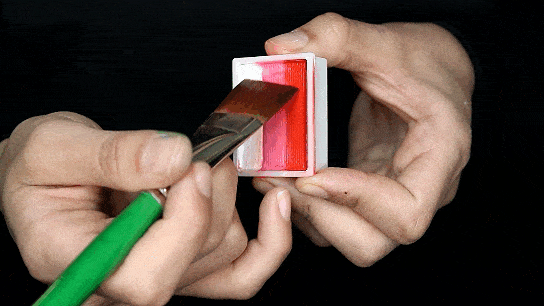 When using a brush, dip it in water and swirl your brush over the makeup until you have a creamy consistency. Some artists prefer to create a trench or valley in each color for loading round brushes, and they twist the brush as they pull the brush across the face paint. Other artists prefer to make a small divot in each color where they mix water into the face paint. Both of these techniques work well, so if you are a new face painter, try each of them to determine which works best for you.