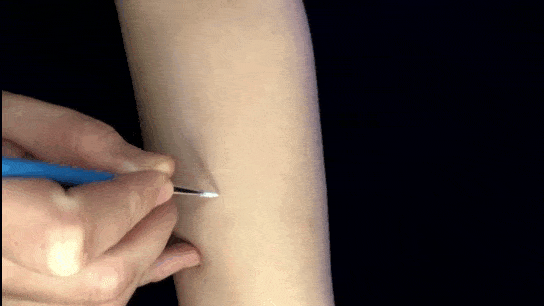 Begin making a teardrop by pressing down with a round bush and then lifting the brush slowly off the skin. You should have a line that begins thick and ends at a nice sharp point. You should also be able to make teardrops thin to thick by beginning with your brush barely touching the skin as you move your brush and gradually pressing down until you stop the stroke at the wide end.