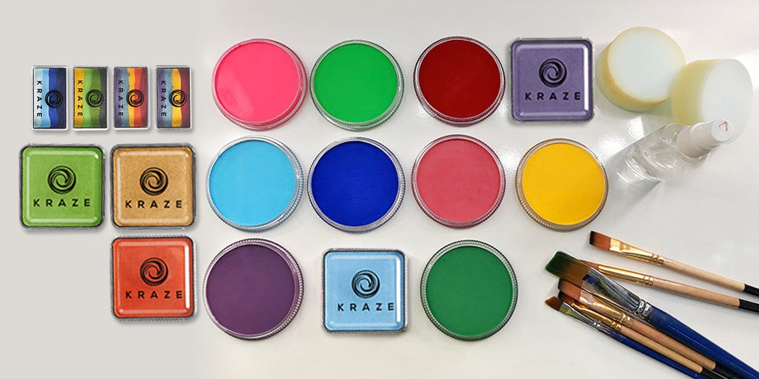 Something else to consider when you are buying face paints is how they can be organized. Kraze FX is a brand of face paint which is designed so that the individual pans stack together. Both single colors and split cake containers are all the same size and stack. The Kraze FX square containers will also line up neatly on your table if you choose not to use a palette case.