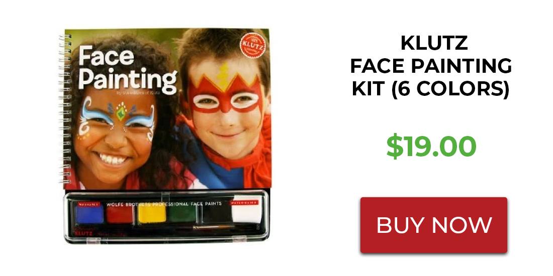 Wolfe FX face paints have been a historical favorite in the face painting industry, so the Klutz Face Painting Kit packs a powerful creative punch with its brilliant water-based makeup. This portable palette contains enough blue, red, yellow, green, black, and white for approximately twenty faces, depending on the designs chosen, as well as one brush for application. As a wax-based paint, Wolfe FX face paints are known for their durability and easy flow from the brush.