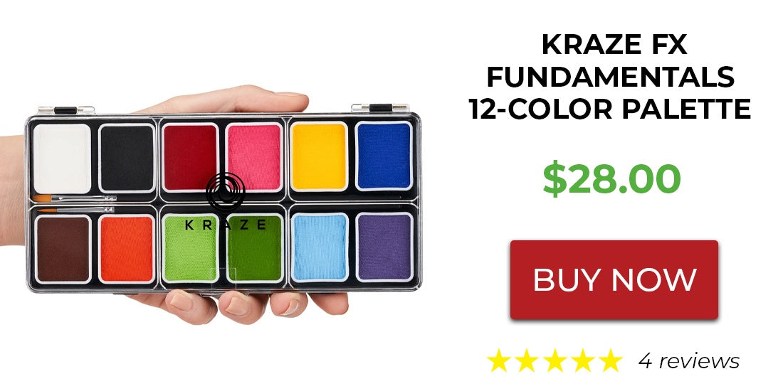 For parents or volunteers who don't normally face paint as professionals, the Kraze Regular Palette pictured below has 12 colors, which are good for approximately 60 designs, and comes with two brushes. Kraze formula is non-toxic, hypoallergenic, vegan, and cruelty-free, making it a safe choice for painting on children. It's all you really need to start.