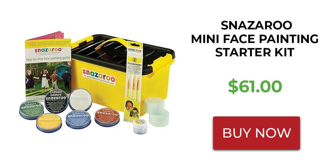 Made with non-toxic, hypoallergenic ingredients which meet the standards for cosmetic safety in the United States, Canada, and Europe, the Snazaroo Mini Face Painting Starter Kit is a great option for fun at home with your own children, or even for larger events as a volunteer. Each Snazaroo kit has six individual 18 milliliter containers of glycerin-based face paint in Bright Red, Sky Blue, White, Grass Green, Bright Yellow, and Black. It's a much larger kit than the Kiutz kit and can do about 300 designs.