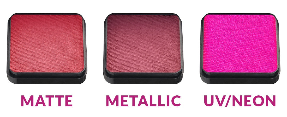 There are three main types of face paint colors: regular colors with a matte finish, metallic colors (also called shimmers or pearls) with a shiny finish, and neon colors, which are UV sensitive and will glow under a black light. Most face painters have an assortment of all of these colors.